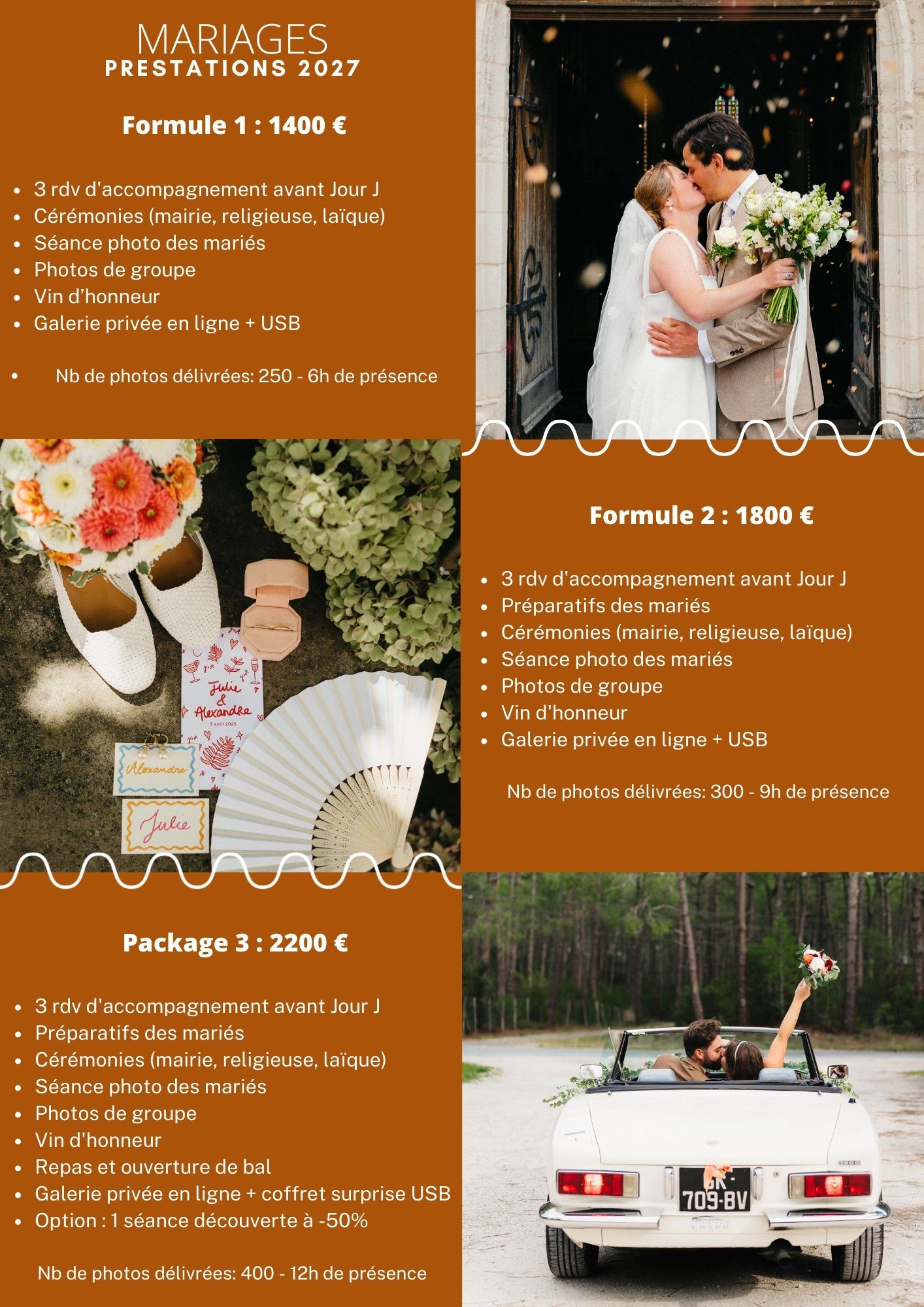 Vos photos seront disponibles à partir de 3 semaines/ 1 mois sur une galerie privée. Vous et tous vos invités pourront visionner les photos. Ensuite vous recevrez un coffret usb avec toutes les photos du mariage.